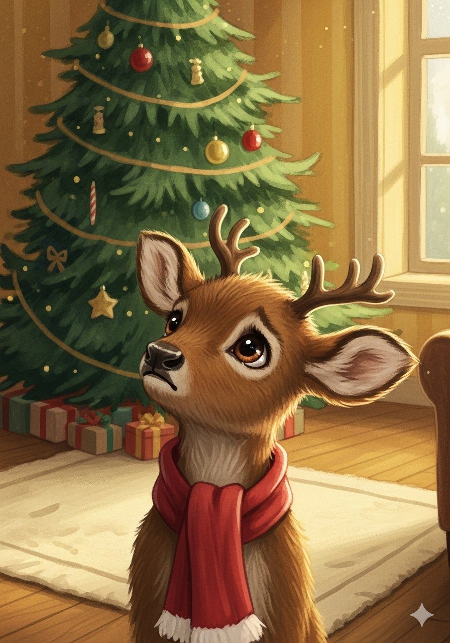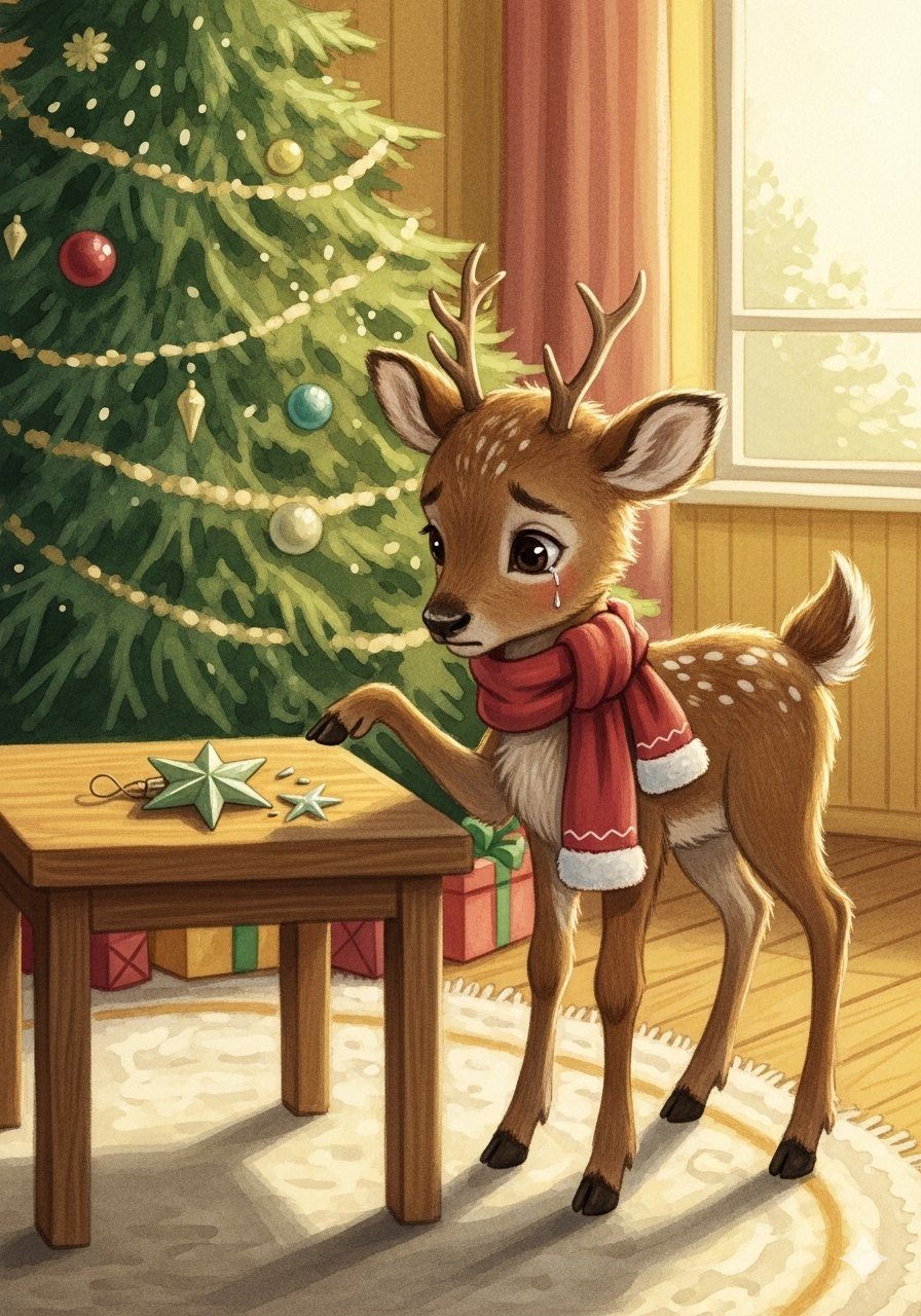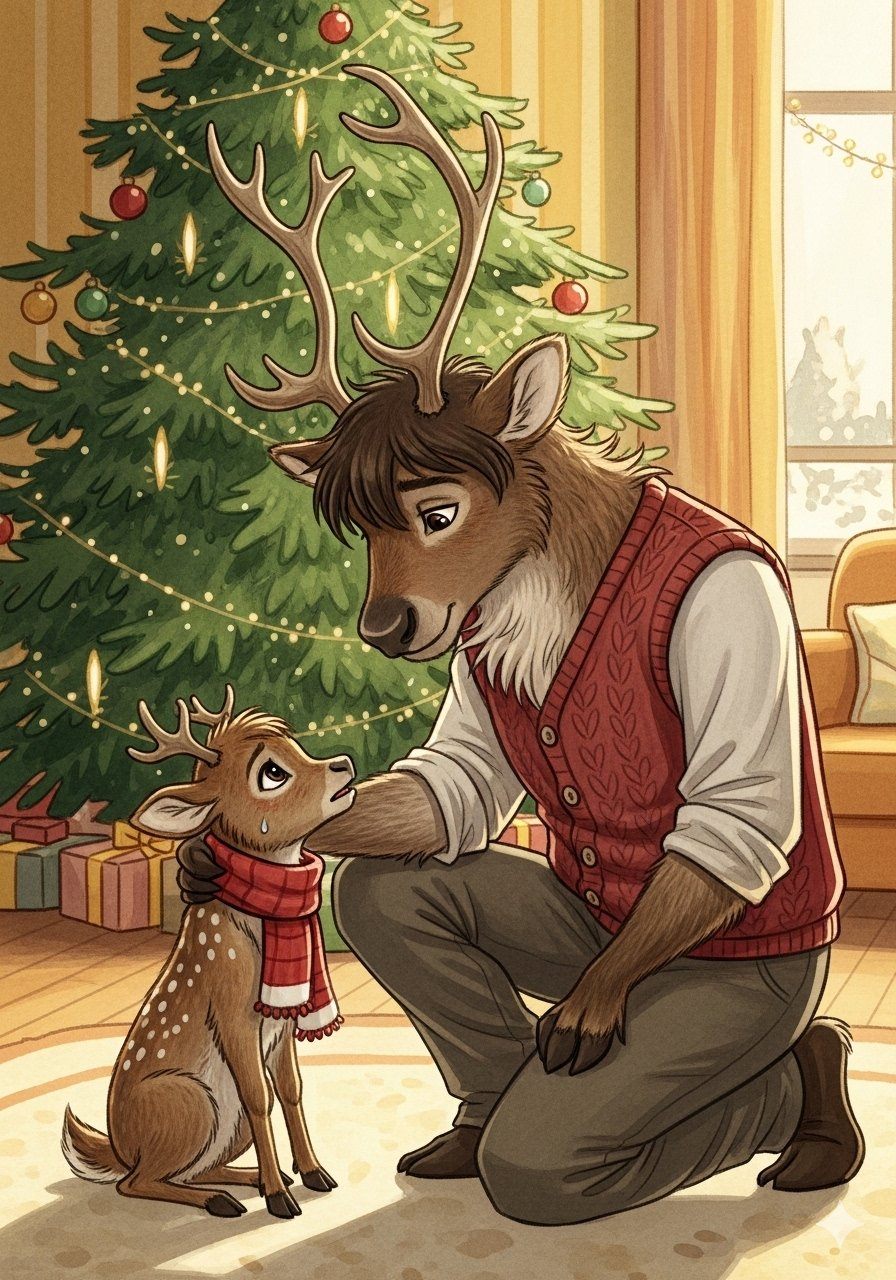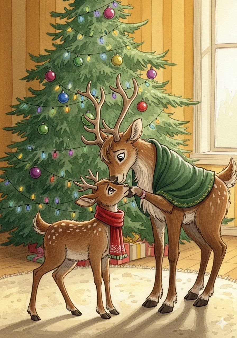 Mama Elara saw her little reindeer looking so glum. "What's the matter, my sweet Niko?" she asked softly, giving him a warm nuzzle.