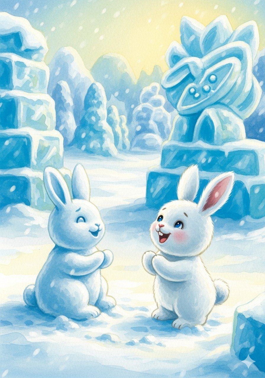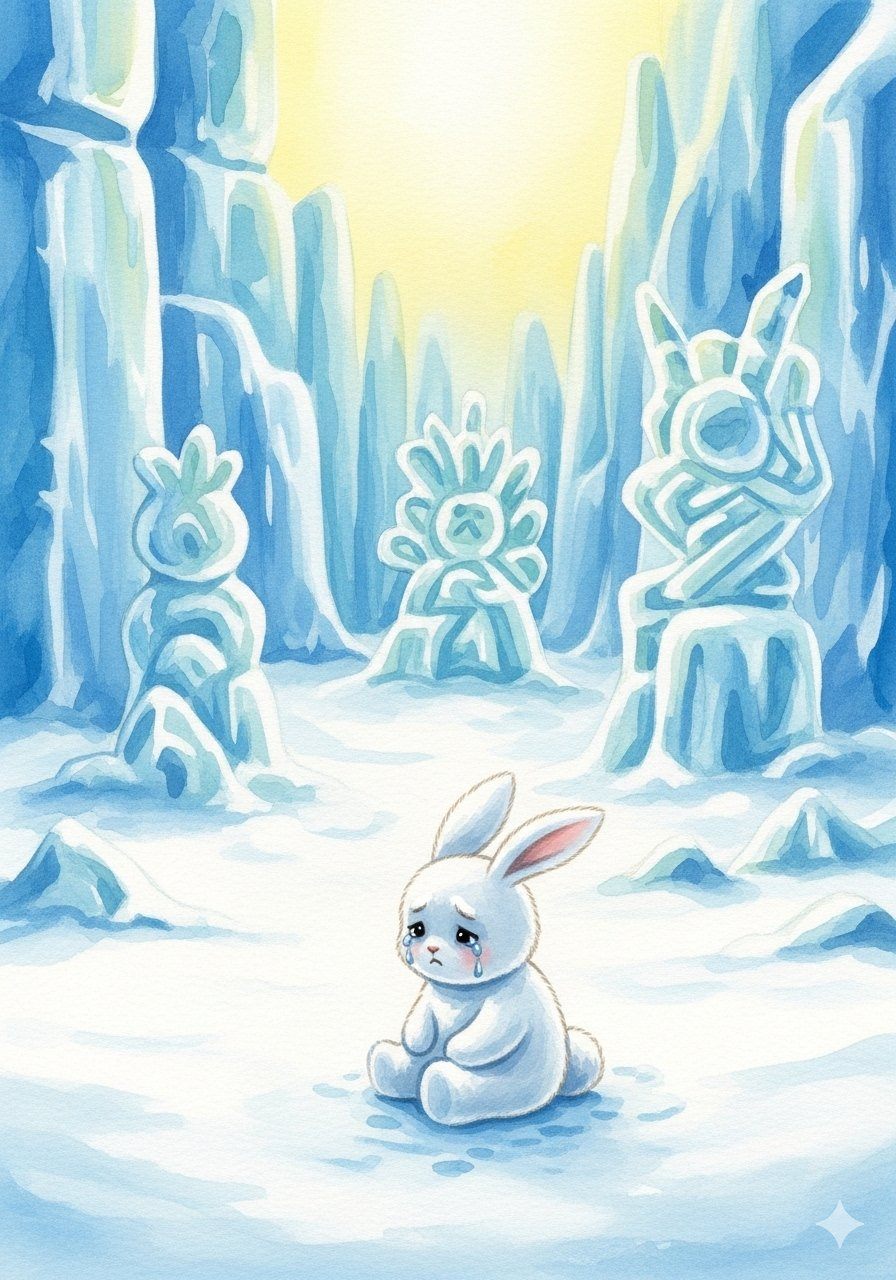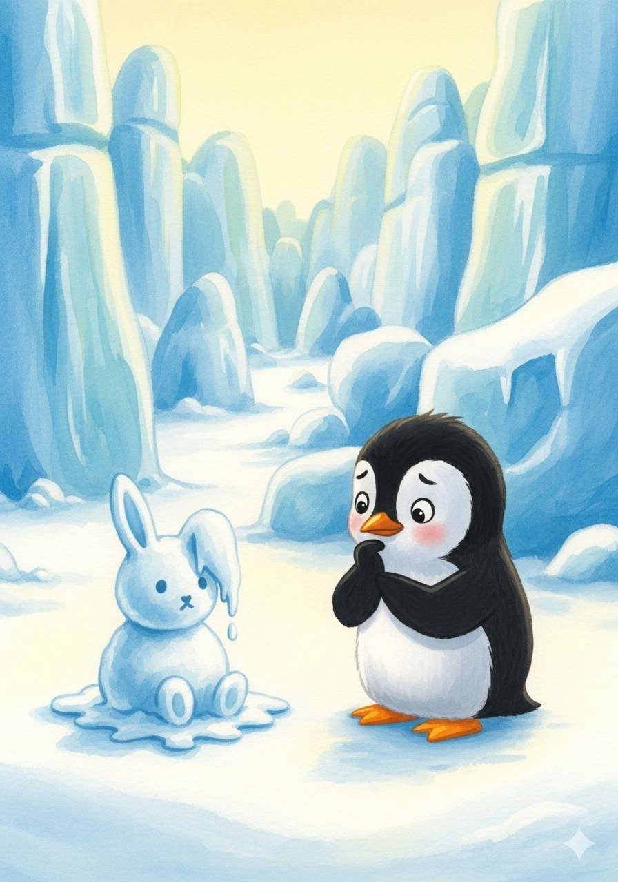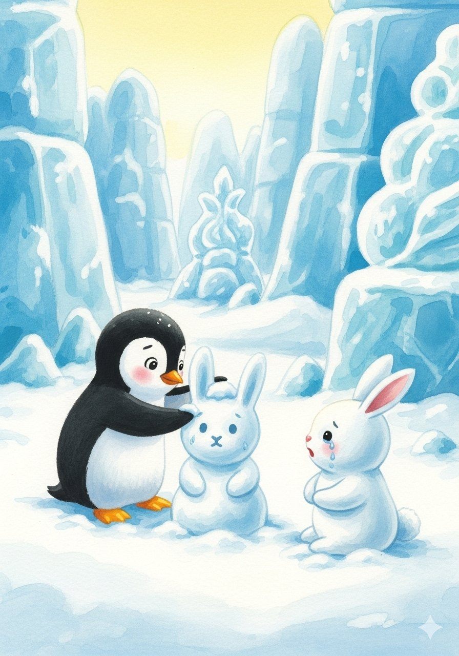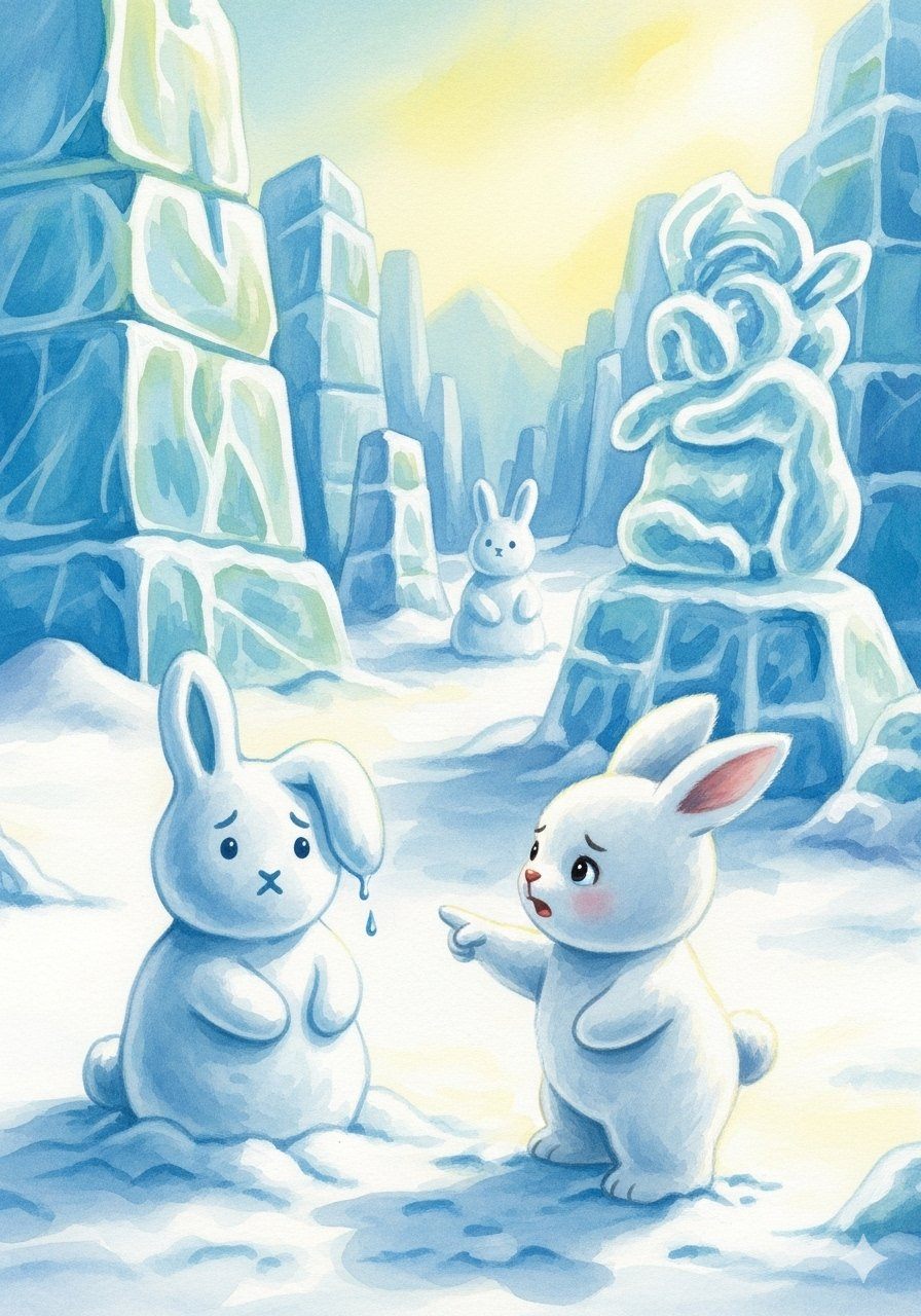 The bunny pointed with her little paw. "My little snow friend is melting," she whispered. A tiny ear had dripped away.
