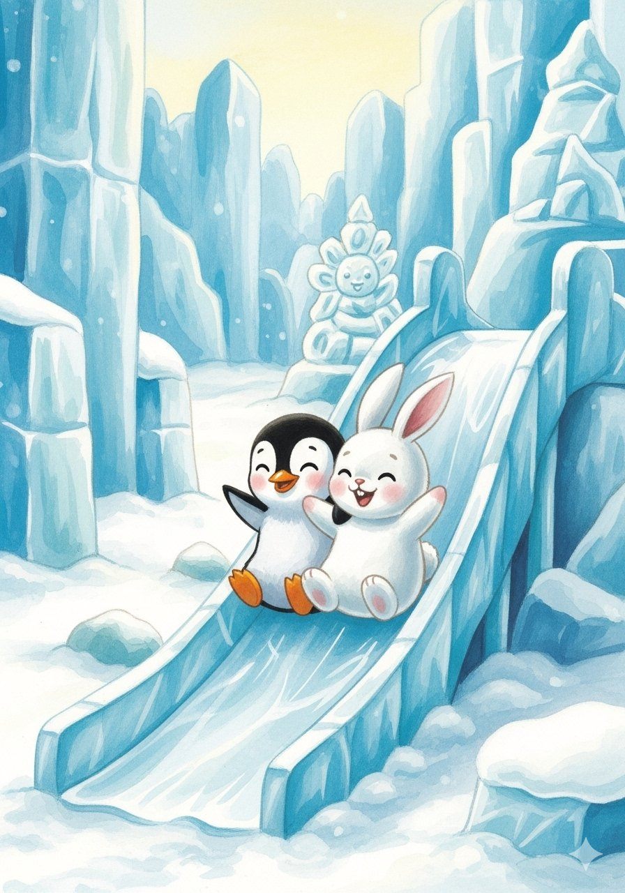 Pip felt happy because his friend was happy. They slid down a little ice slide together, laughing all the way. Hooray for new friends!