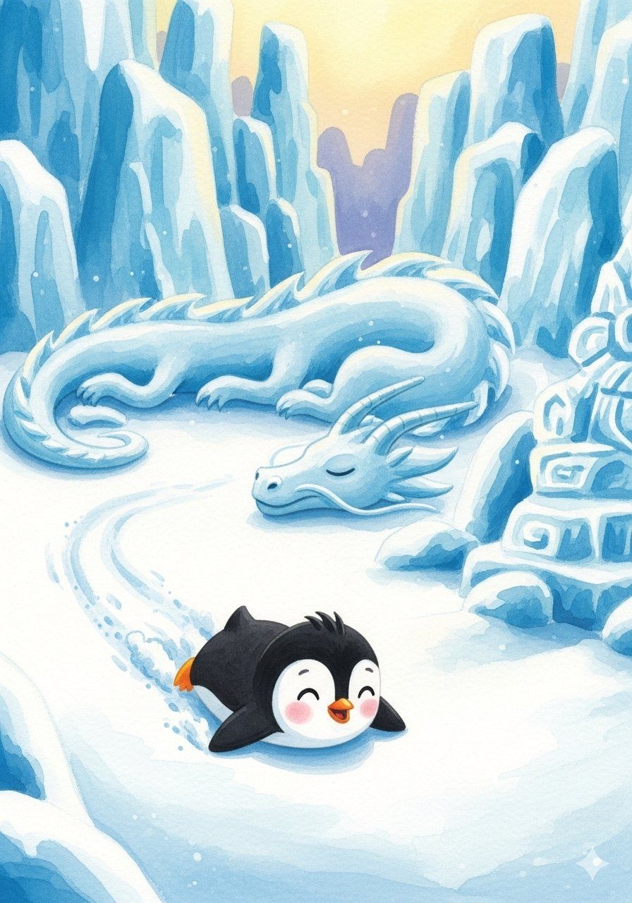 He saw a long ice dragon, sleeping in the snow. Pip felt so happy inside! He did a happy little slide on his belly. Swoosh!